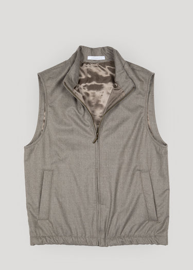 Appearance Flannel Blouson Vest is made of a soft Tech-Flannel from Italian Vitale Barberis Canonico. The special Tech-Flannel is made with the finest wool quality in a Pure WV Super 120'S extra fine Merino wool. The fine smooth (worsted) yarn is spun from combed long-fiber wool, which gives the meter product the super soft surface and at the same time ensures long durability. The vest has a special membrane on the back of the wool textile that is both wind and water repellent. This achieves the elegant expression of the delicious Super 120'S Flannel, combined with the technology in the membrane.