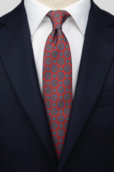 Our silk ties are made with special, beautiful textured weaves that add extra elegance and luxury to the patterned tie in red, green and blue shades. An obvious choice for both the office and festive events when the look needs a little extra sprezzetura vibes.