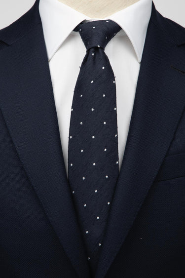 This Shantung tie comes in a deep blue base color that is broken by an elegant white dotted pattern.