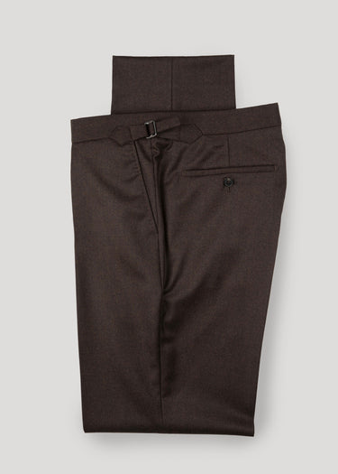This exclusive flannel in a deep dark brown color with a beautiful melange play is woven in 100% extra fine Merino wool in a 270 gr fabric that provides a light and elegant trouser.